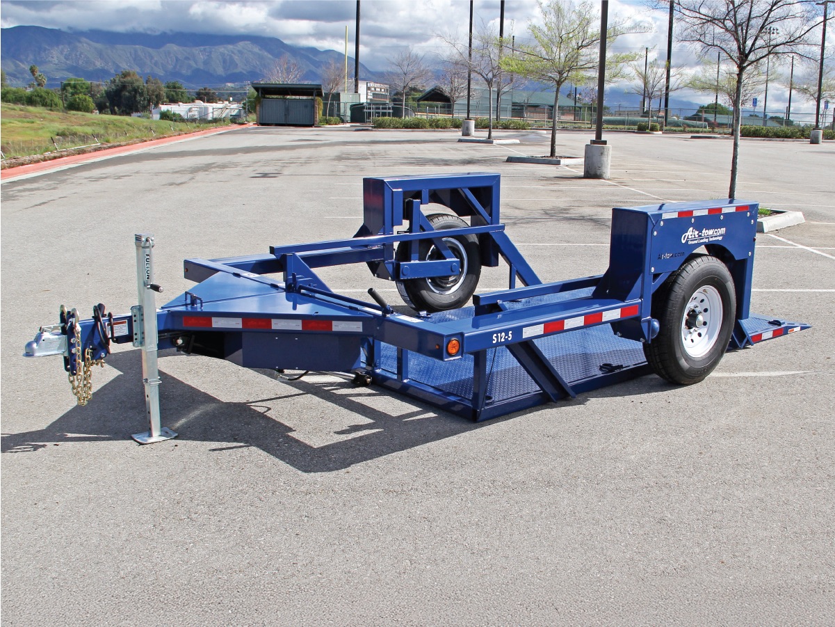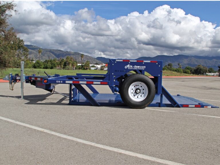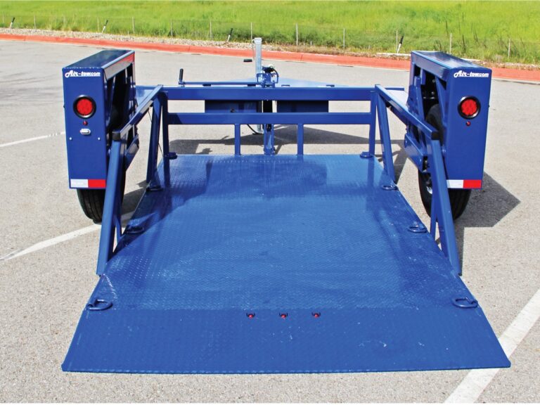 The unique Air-tow flatbed uses a totally different concept to make loading easier and safer. The trailer deck remains completely level as it raises or lowers hydraulically in less than 30 seconds. At ground level, you simply drive your equipment onto the trailer. It is especially useful for equipment with poor traction or low ground clearance such as scissor lifts, sweepers, pavement rollers, etc. Air-tow eliminates the need for difficult tilt beds or dangerous loading ramps, making it a one-man job even in adverse weather conditions.