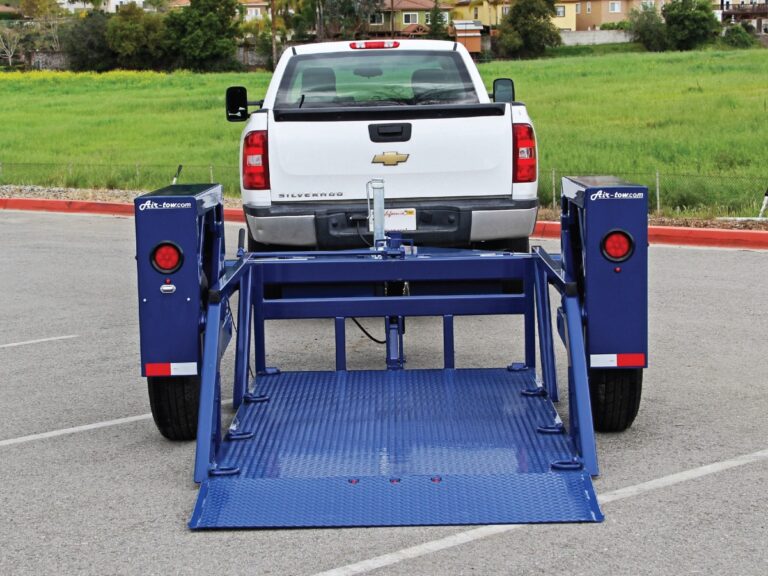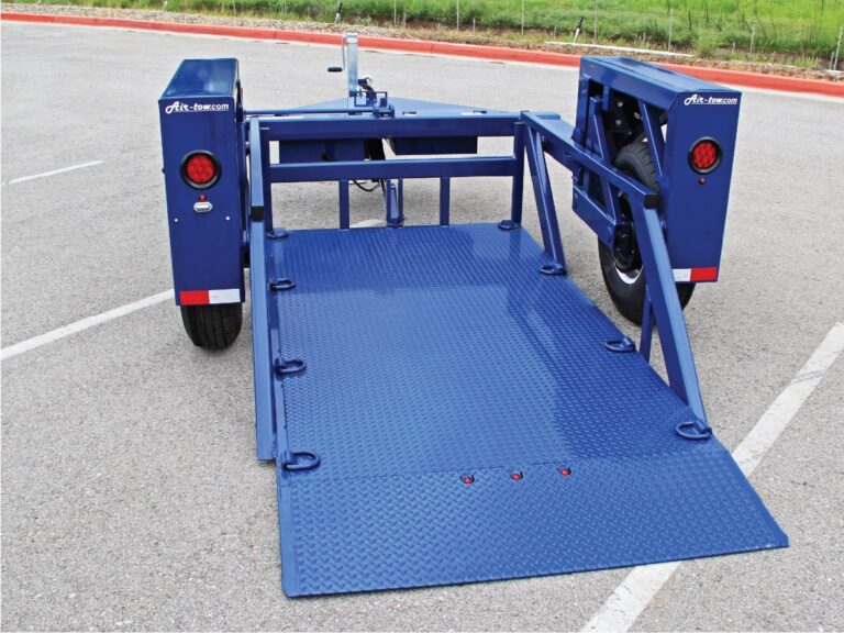 The unique Air-tow flatbed uses a totally different concept to make loading easier and safer. The trailer deck remains completely level as it raises or lowers hydraulically in less than 30 seconds. At ground level, you simply drive your equipment onto the trailer. It is especially useful for equipment with poor traction or low ground clearance such as scissor lifts, sweepers, pavement rollers, etc. Air-tow eliminates the need for difficult tilt beds or dangerous loading ramps, making it a one-man job even in adverse weather conditions.