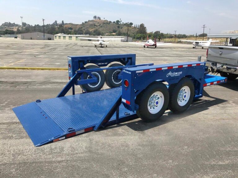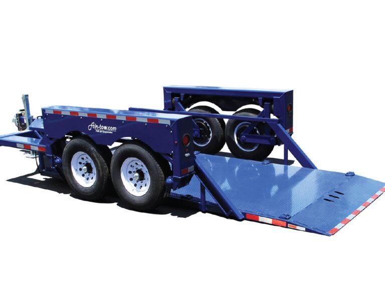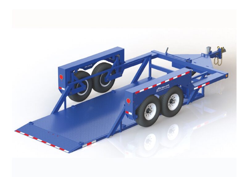 The unique Air-tow flatbed uses a totally different concept to make loading easier and safer. The trailer deck remains completely level as it raises or lowers hydraulically in less than 30 seconds. At ground level, you simply drive your equipment onto the trailer. It is especially useful for equipment with poor traction or low ground clearance such as scissor lifts, sweepers, pavement rollers, etc. Air-tow eliminates the need for difficult tilt beds or dangerous loading ramps, making it a one-man job even in adverse weather conditions.