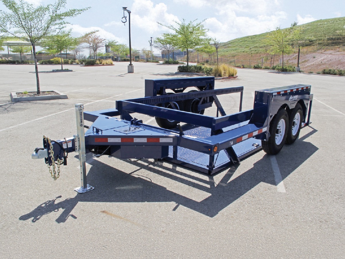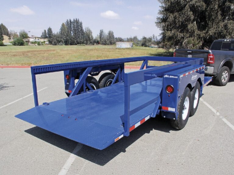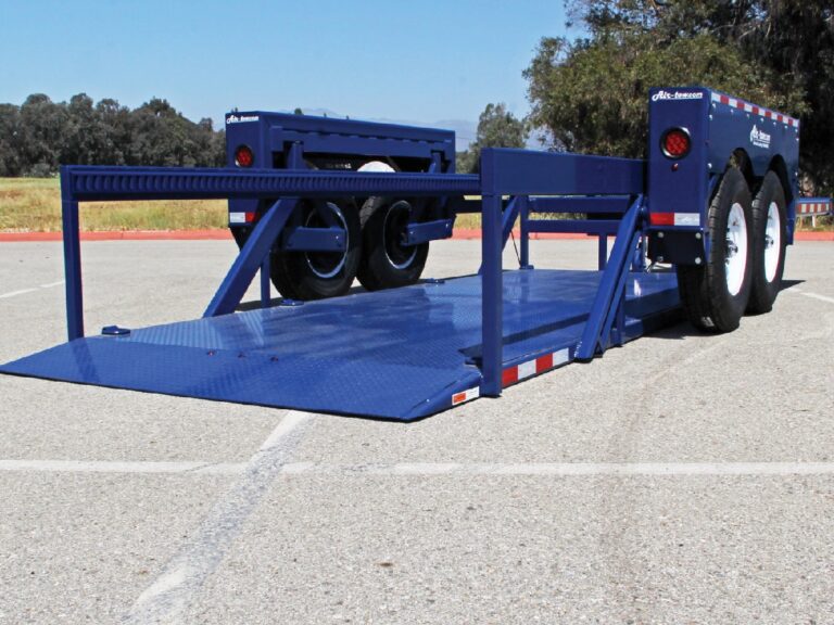 The unique Air-tow flatbed uses a totally different concept to make loading easier and safer. The trailer deck remains completely level as it raises or lowers hydraulically in less than 30 seconds. At ground level, you simply drive your equipment onto the trailer. It is especially useful for equipment with poor traction or low ground clearance such as scissor lifts, sweepers, pavement rollers, etc. Air-tow eliminates the need for difficult tilt beds or dangerous loading ramps, making it a one-man job even in adverse weather conditions.