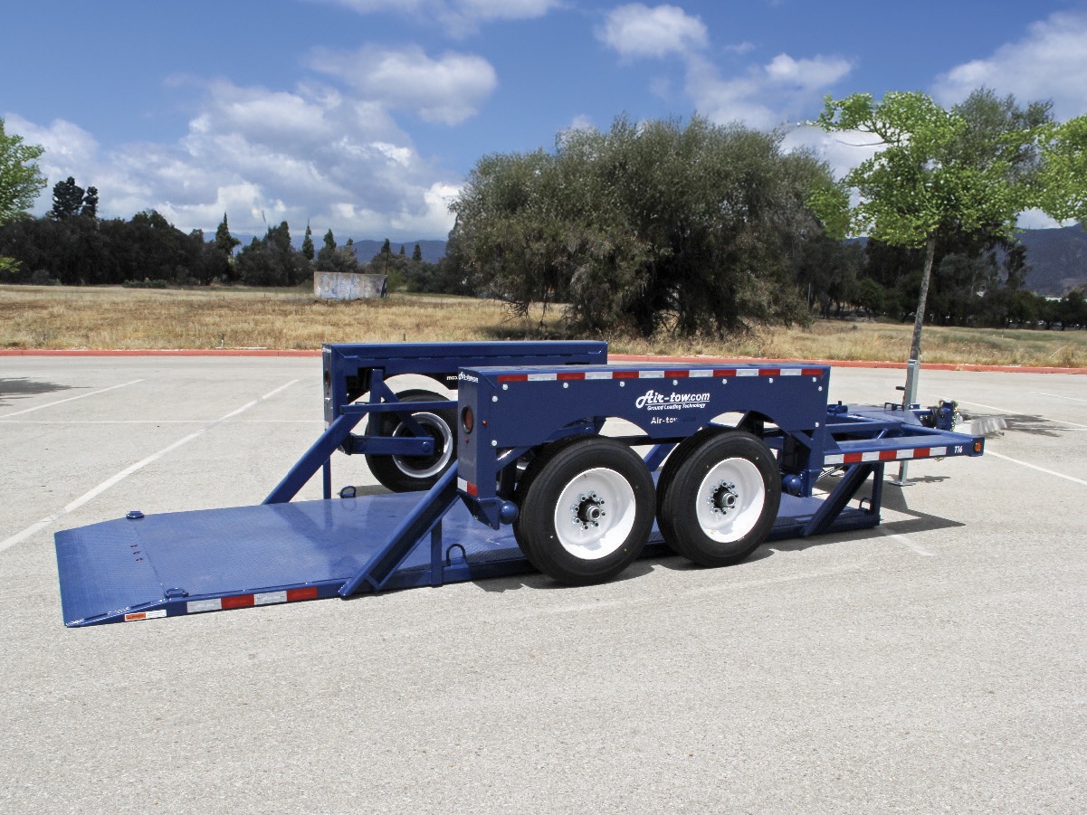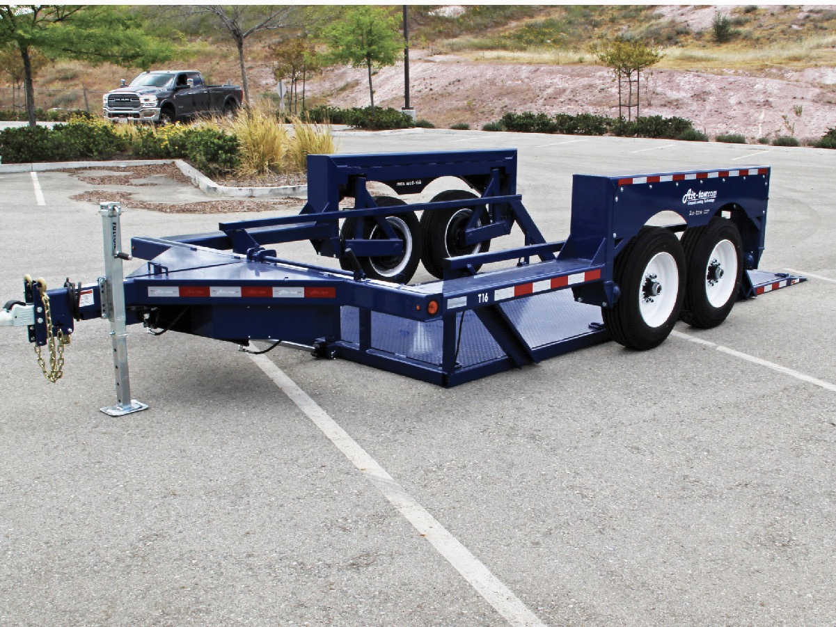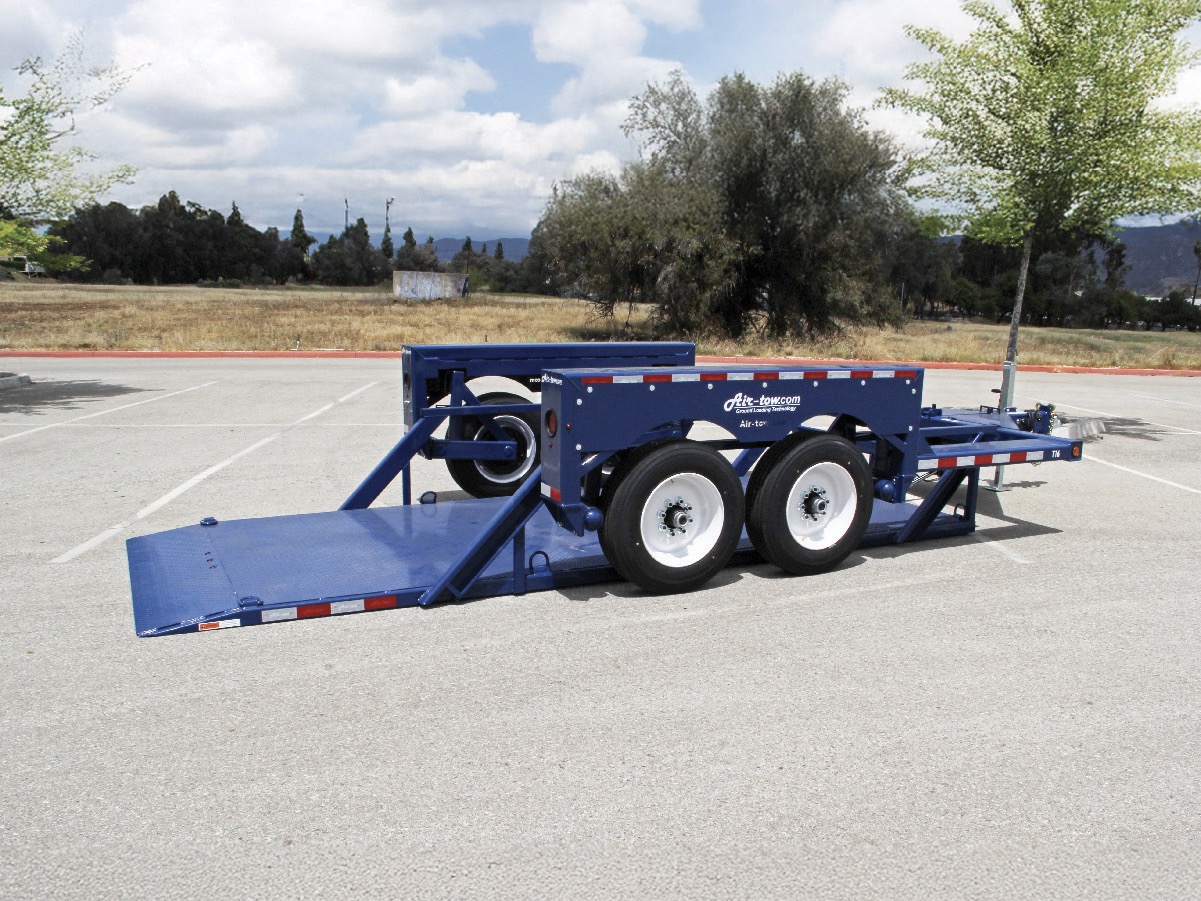 The unique Air-tow flatbed uses a totally different concept to make loading easier and safer. The trailer deck remains completely level as it raises or lowers hydraulically in less than 30 seconds. At ground level, you simply drive your equipment onto the trailer. It is especially useful for equipment with poor traction or low ground clearance such as scissor lifts, sweepers, pavement rollers, etc. Air-tow eliminates the need for difficult tilt beds or dangerous loading ramps, making it a one-man job even in adverse weather conditions.